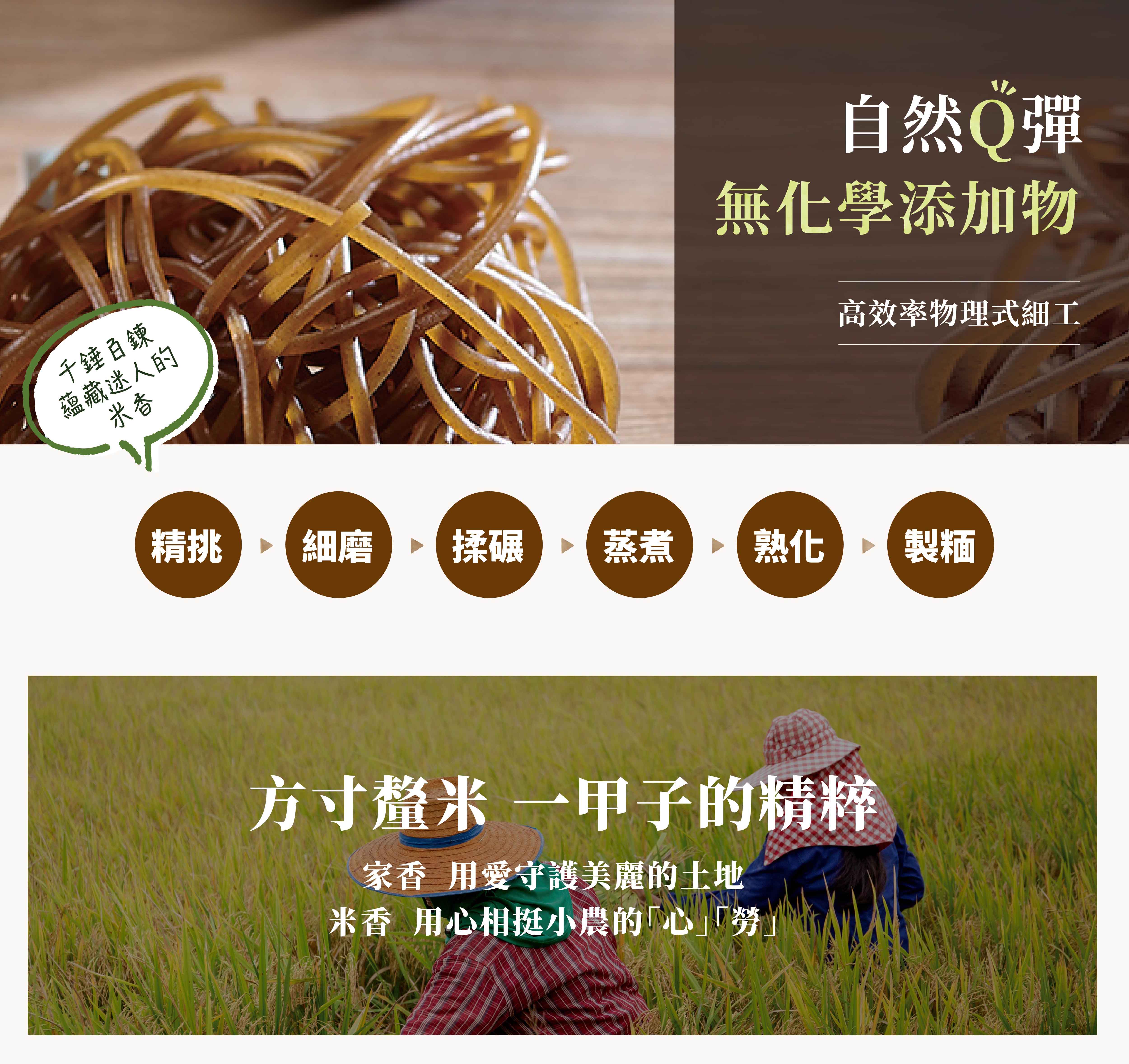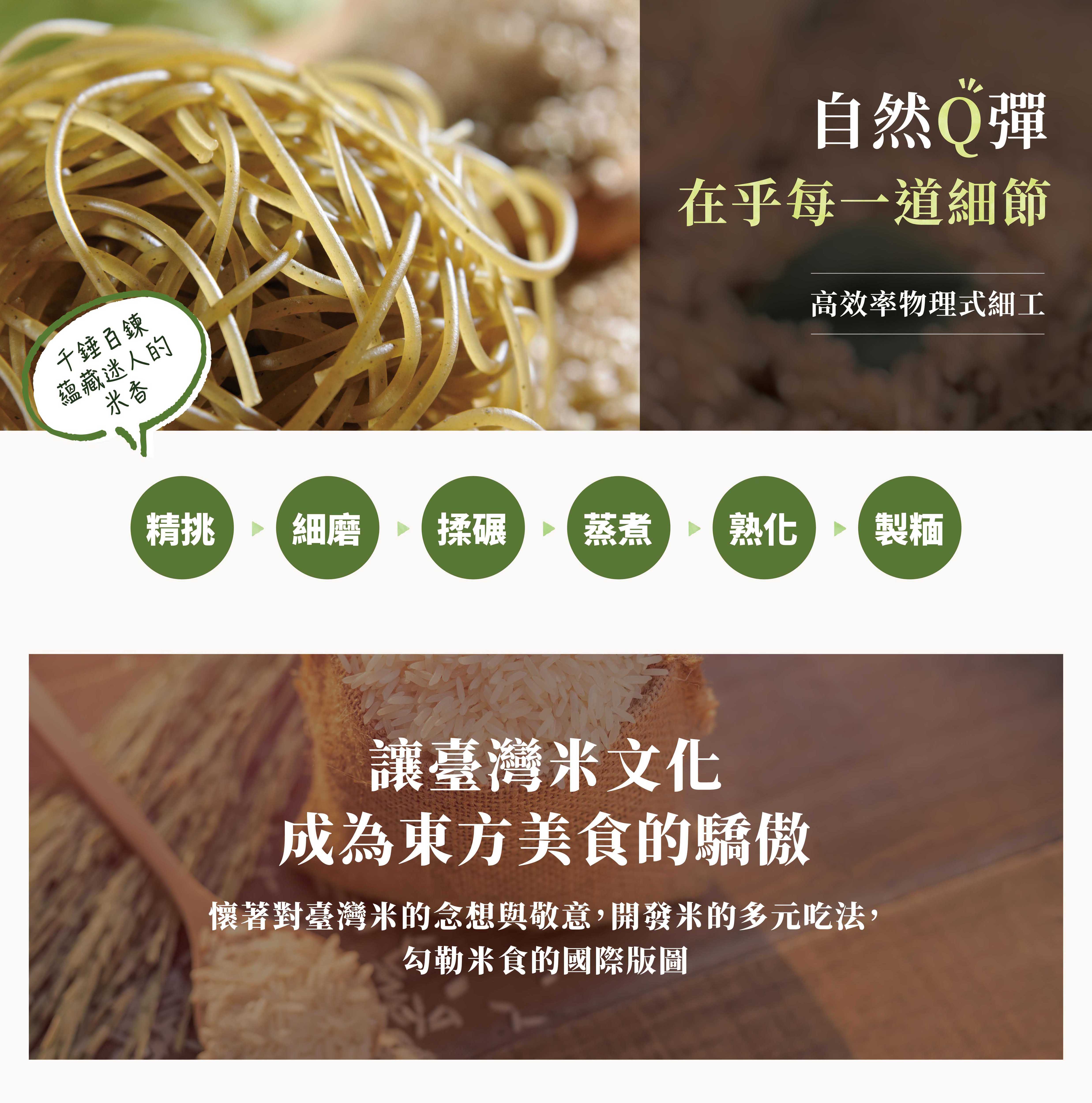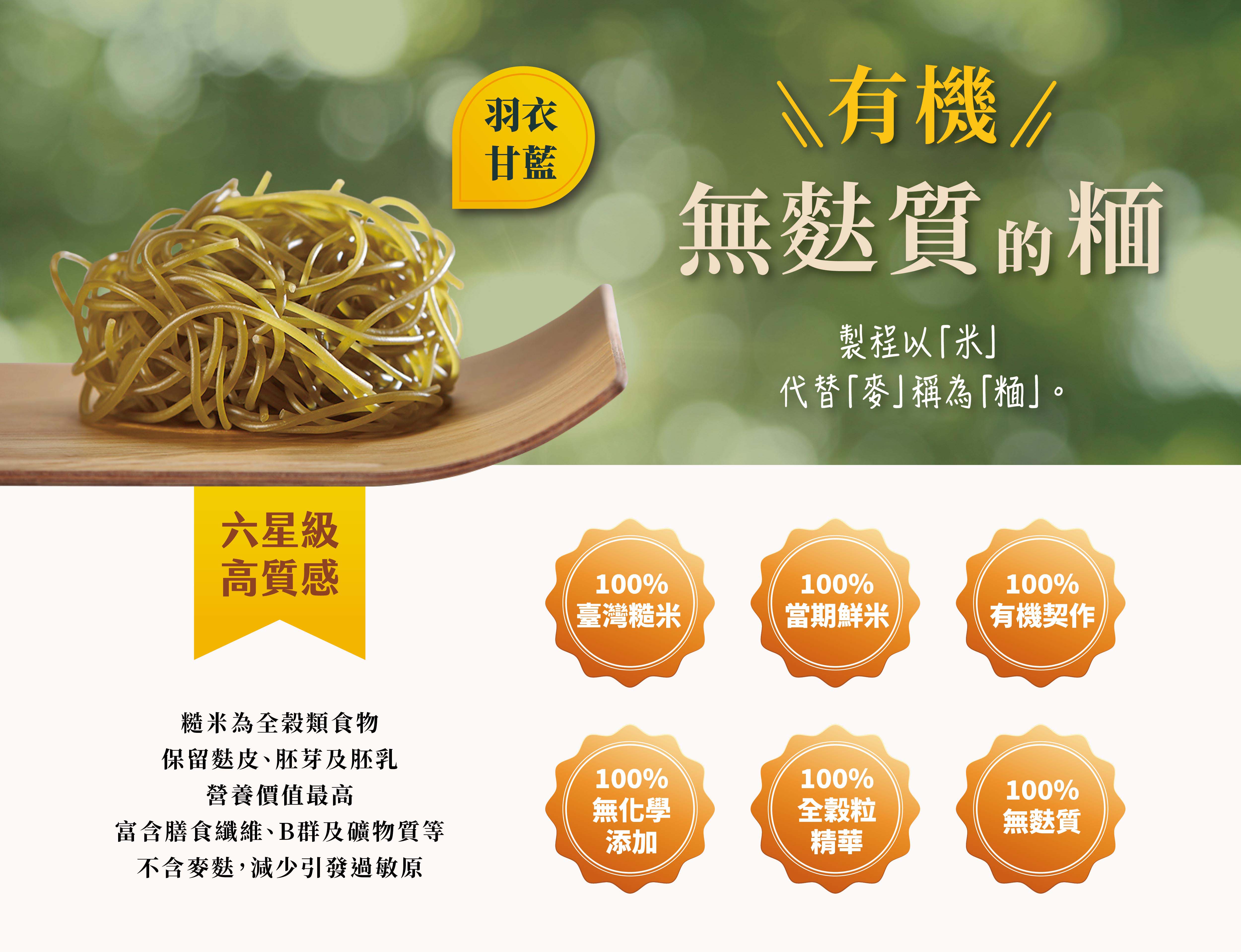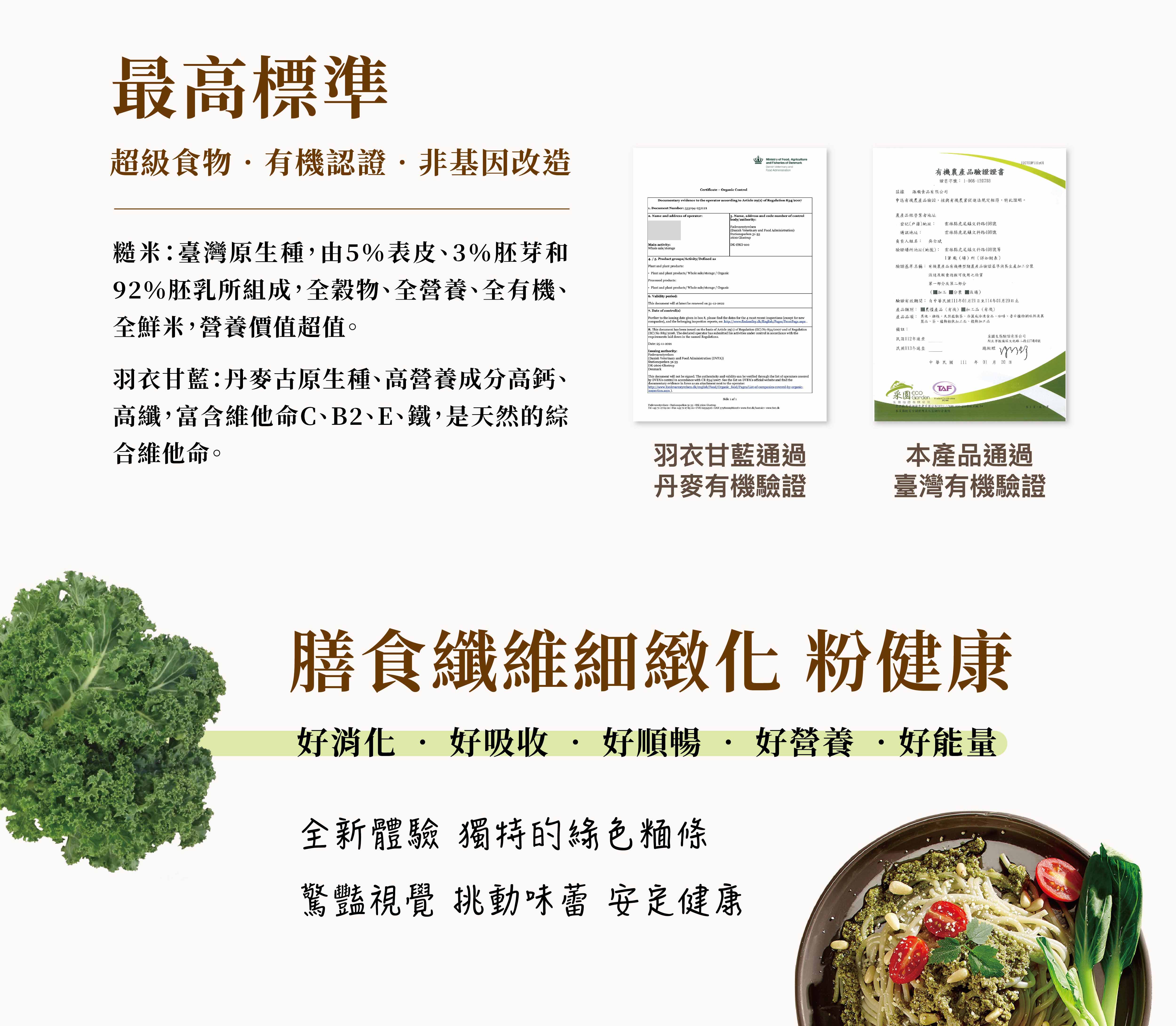 有機羽衣甘藍糙米麵條:有機糙米(台灣)、羽衣甘藍蔬菜粉(丹麥)、水