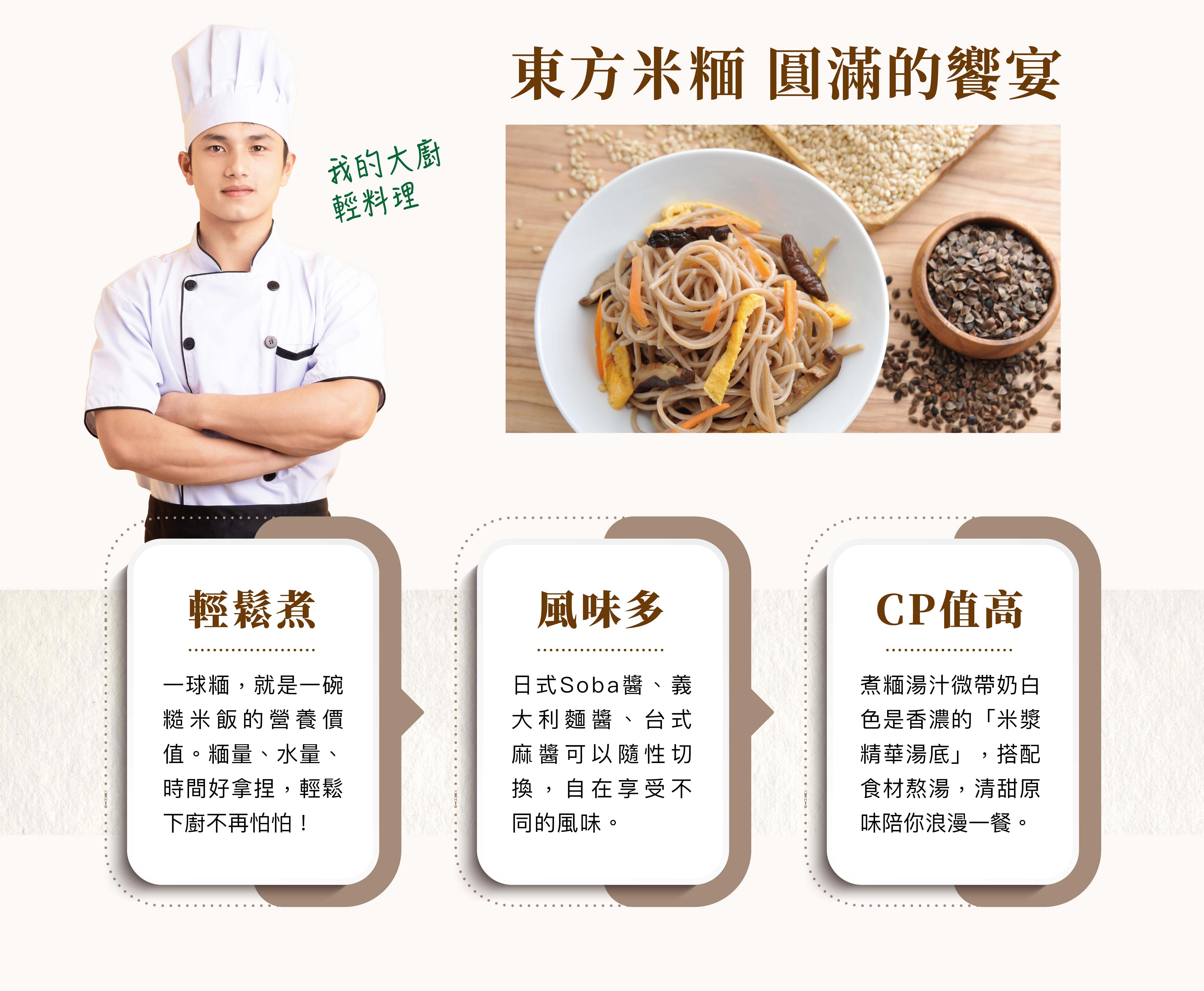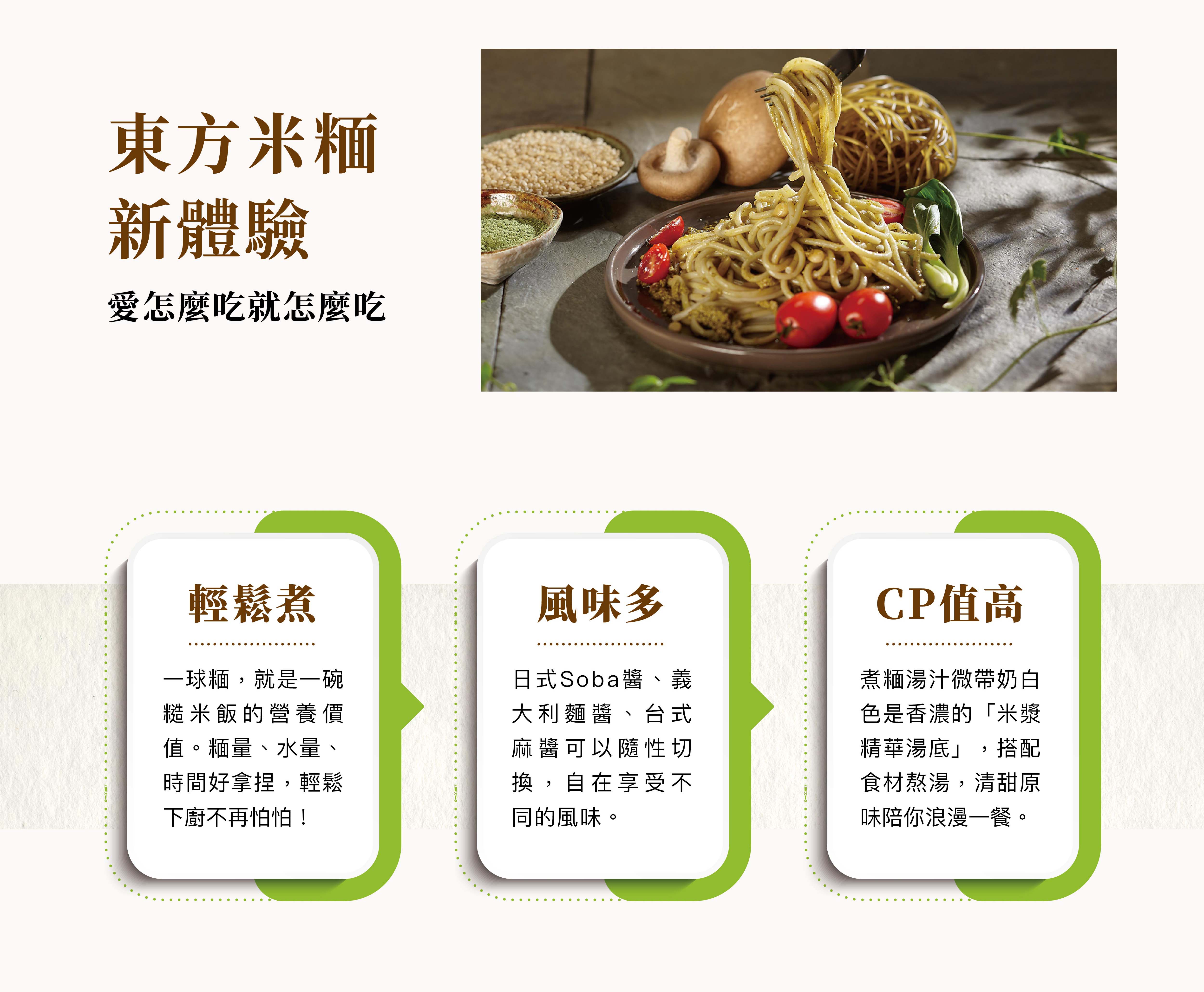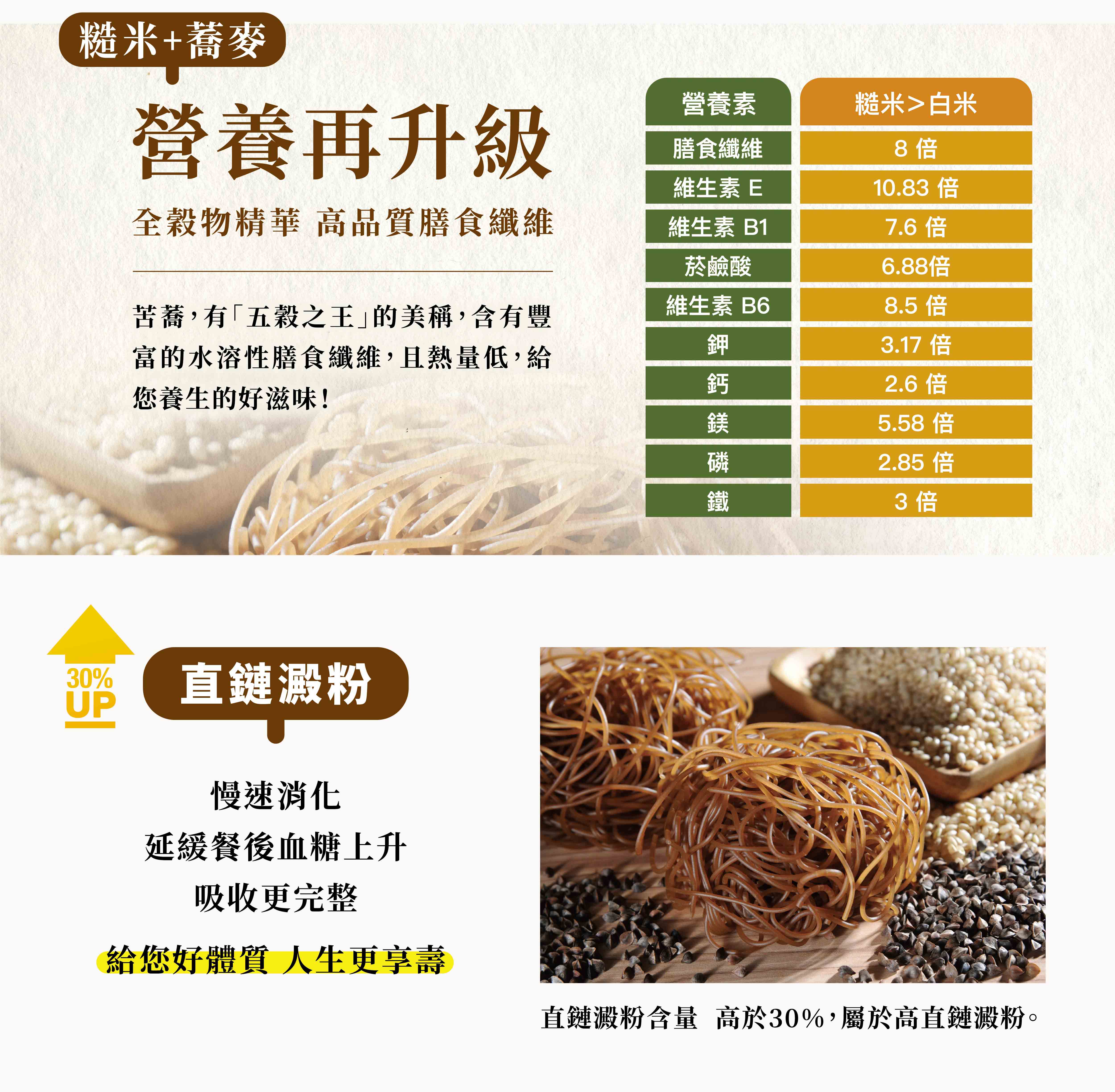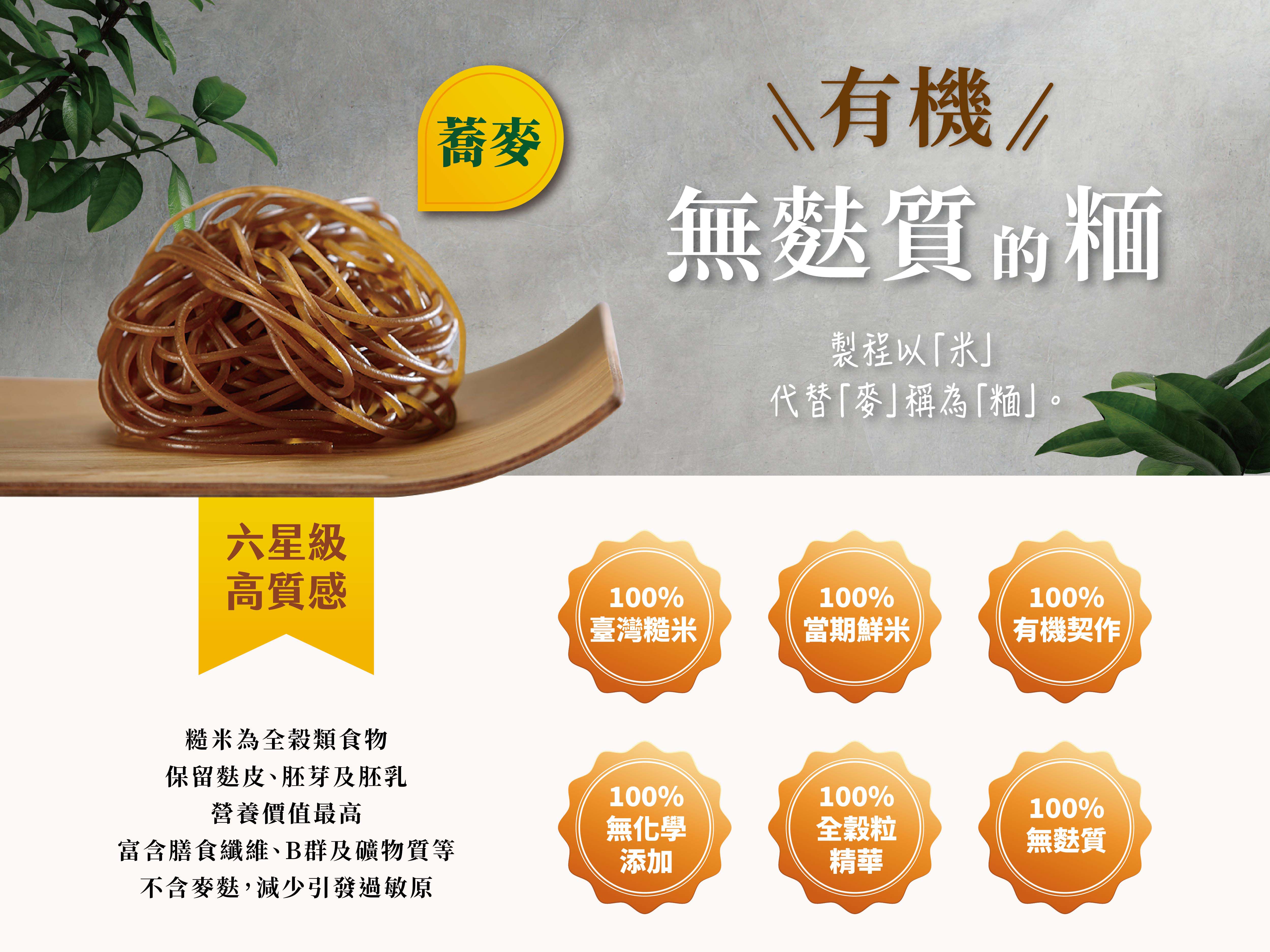 有機蕎麥糙米麵條:有機糙米(台灣)、蕎麥(台灣)、水