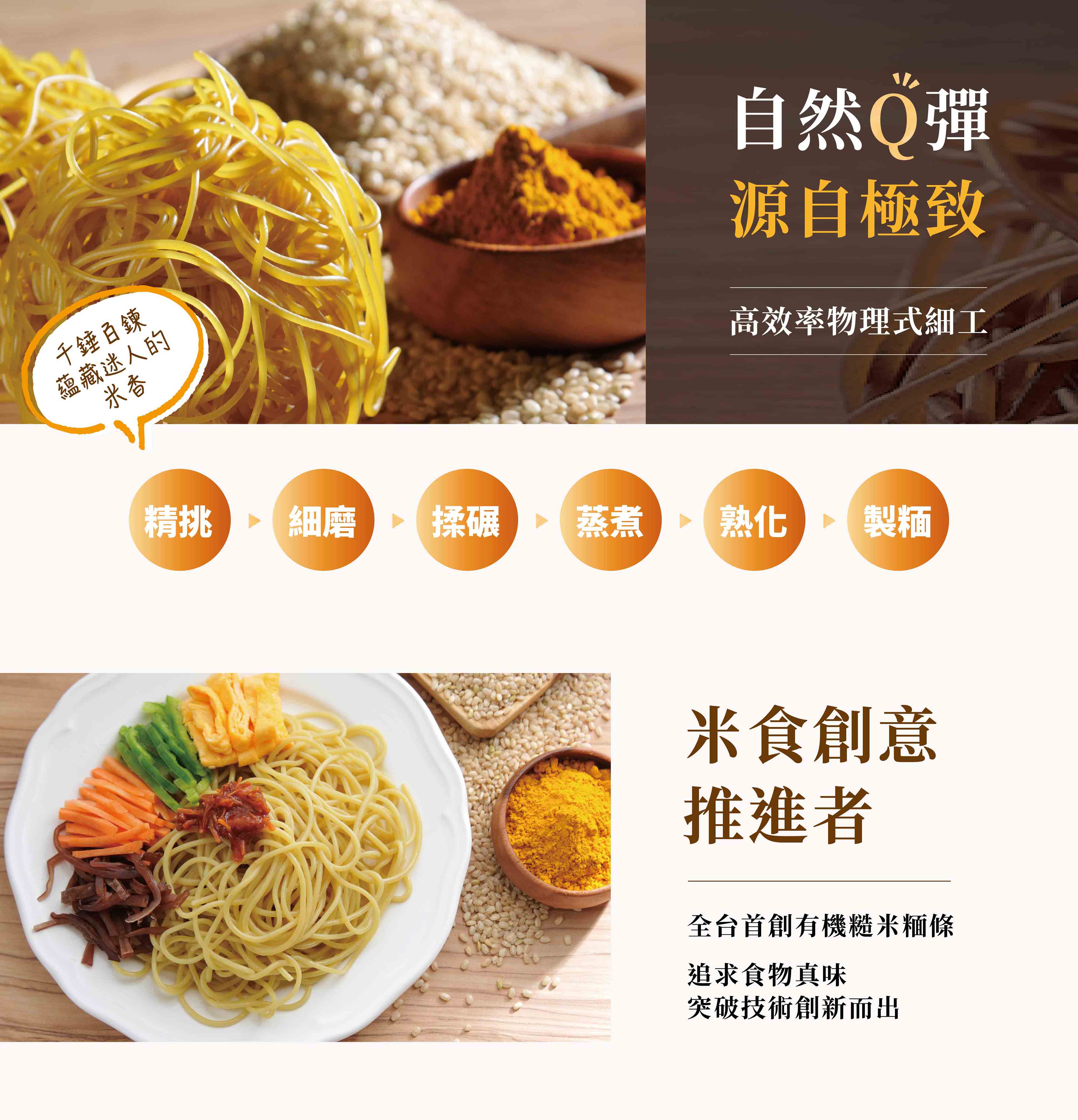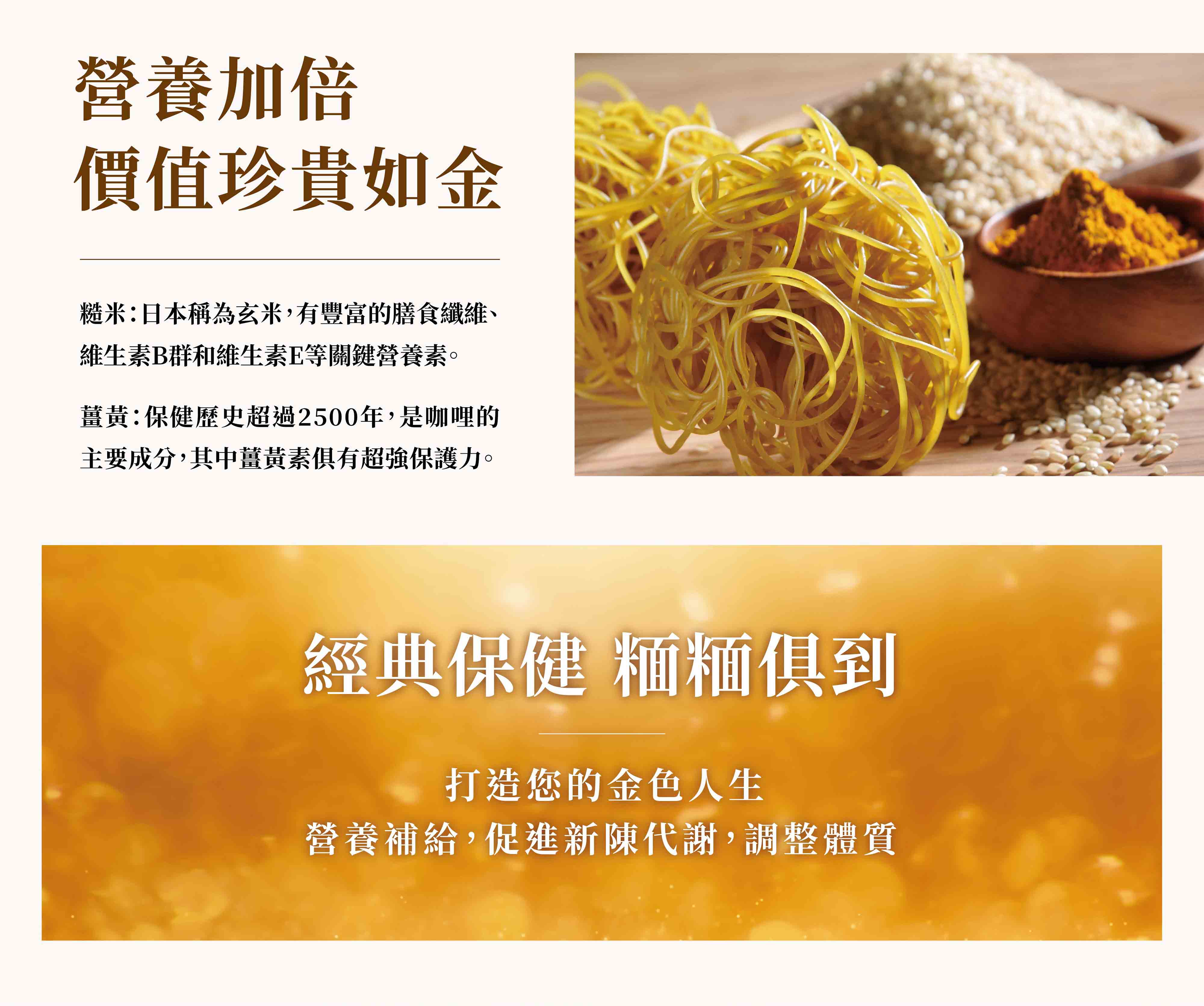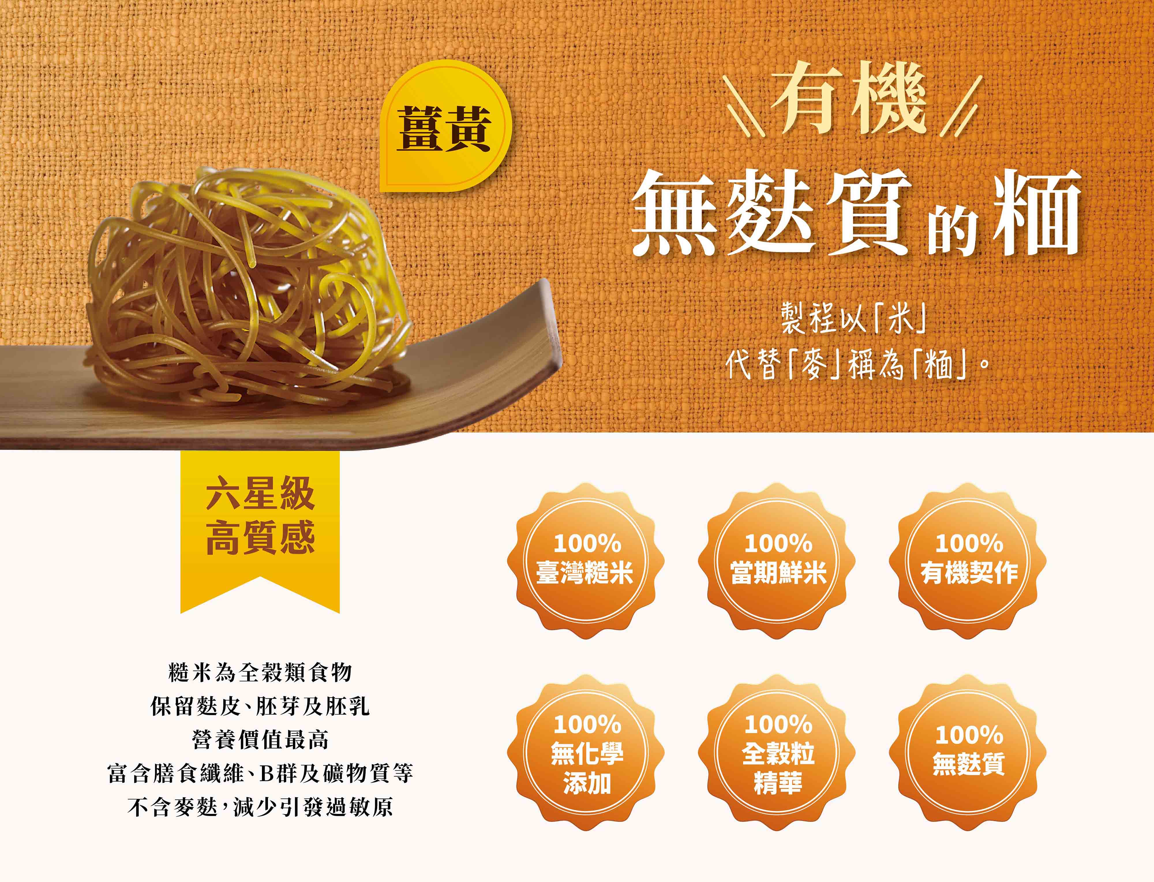 有機薑黃糙米麵條:有機糙米(台灣)、有機薑黃(台灣)、水